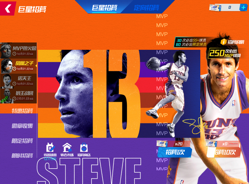MVP卡池全员首次十连免费!至多抽取250次,成功将MVP太阳纳什签约入队!130抽必出SS+限定球员,每30抽必出大师球员!