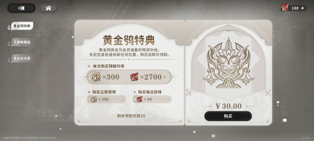 明明是给了跳转权限的,买68通行证的时候,怎么自己不允许支付宝启动啊,笑死我了,合着这个通行证不让氪是吧。但是月卡是可以氪的(图4)。然后氪完我就迷茫了,我为了看月卡返几张,去看了看公告,哎,不对,这个月卡到底是叫黄金枭还是黄金鸮呢?到时候告诉我不是一个东西不给我返咋办。。。