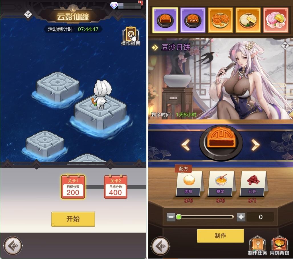 »月饼工坊:日常参与挂机收益、失落遗迹、神域花园有概率获得月饼制作食材,食材分为多种品质,品质越高做出来的月饼食用后奖励也相对越高。