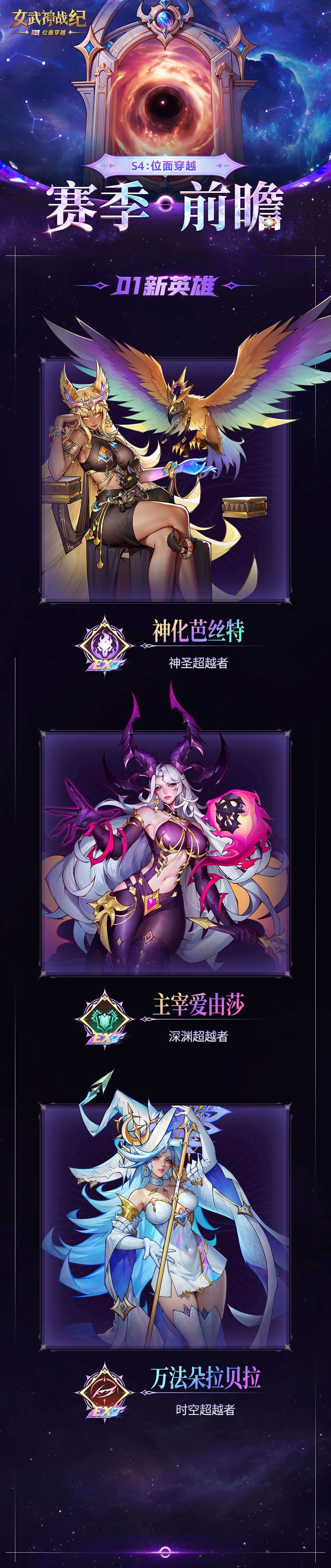 S4赛季:位面穿越即将在10月2日上线,在新的赛季里面,我们加入了三位新英雄:神化芭丝特,主宰爱由莎以及万法朵拉贝拉,具有女武神羁绊+1效果的新养成系统「英雄升华」以及可以免费使用到所有新英雄和神器的全新PVP玩法「次元竞技场」。