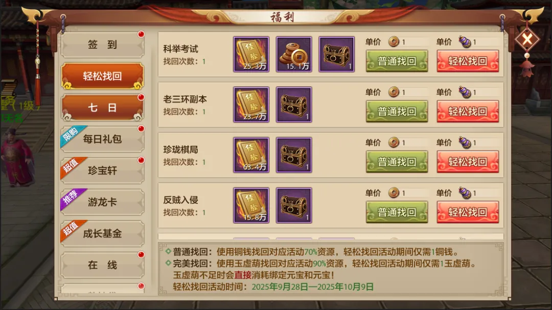 这个假期,尽管放心出门玩耍!天龙也为大家备好了一份安心礼——轻松找回功能暖心回归!出门在外,难免错过游戏内的日常活动,别担心,在9月28日至10月9日期间,少侠只需消耗1铜钱或者1玉虚葫即可找回前一天未完成的活动奖励哦,少侠无需担心错失每日活动的奖励啦!
