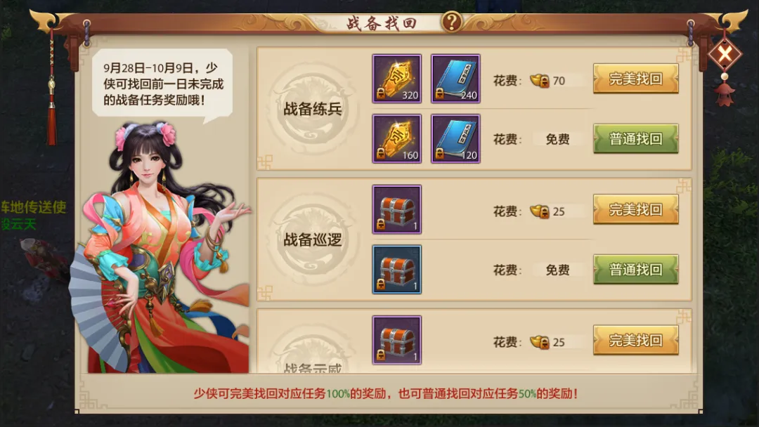 完美找回:消耗少量绑元,即可100%获得全部任务奖励!