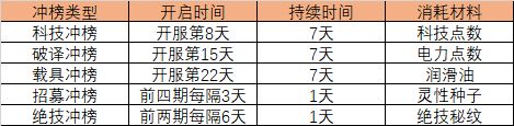 获得的材料可根据各种冲榜的开启时间合理安排使用,以下为冲榜活动的开启时间表。