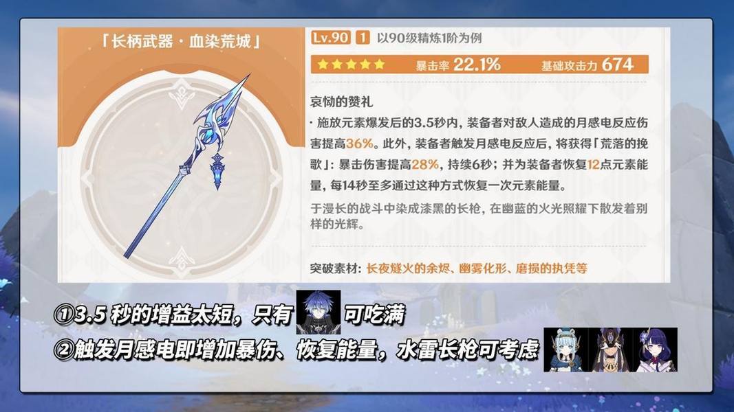 【血染荒城·长枪】674基础攻击、22.1%暴击率。武器特效适配角色不多: