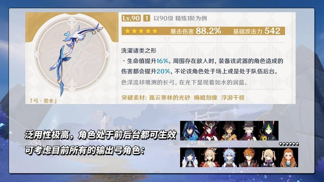 【若水·弓】542基础攻击力、88.2%暴击伤害、16%生命、20%增伤。简单直白的数值,没有任何机制方面的限制,哪怕角色处于后台同样生效,泛用型输出弓,这适配角色可多了:欧洛伦、恰斯卡、赛索斯、林尼、提纳里、埃洛伊、夜兰、宵宫、甘雨、达达利亚、菲谢尔。