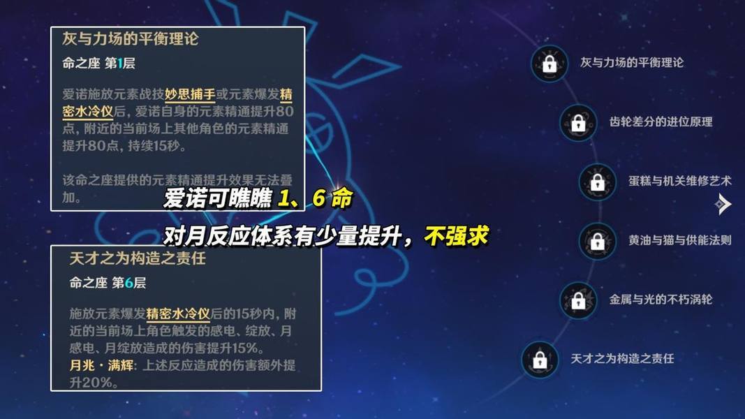 爱诺可瞧瞧“1命全队80精通”、“6命感电绽放35%增伤”,对伊涅芙、菲林斯、6命菈乌玛有少量提升,甚至未来奈芙尔应该也可组队;