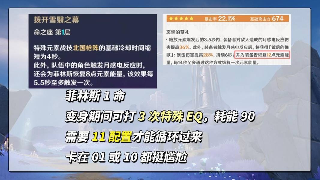 为何没有中间过渡的01或10配置呢?这就要说到菲林斯战技变身后的“特殊战技+特殊爆发”组合输出了,0命变身期间打2次即60耗能,1命则提升到3次90耗能,爆发更强的代价则是充能要跟上,需要专武与1命双回能才能支撑起这个能量消耗。