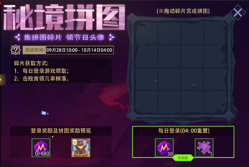 活动内容:活动期间,每日登录游戏可领取魔晶及随机拼图碎片奖励。另外,在(冒险模式/冒险试炼场/梦魇模式)下击败首领也有几率掉落拼图碎片。集齐所有拼图碎片并拼凑完整,还可以获得限定头像“旗开得月”。