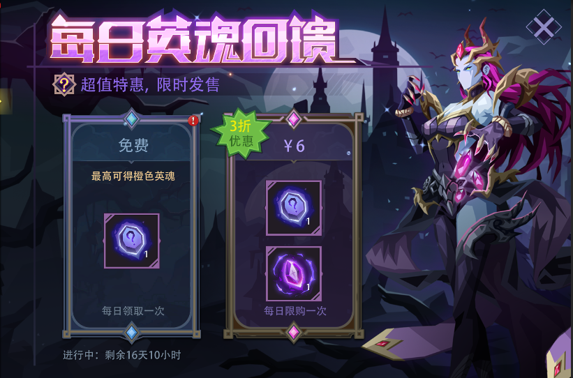 活动内容:活动期间,免费礼包每日可领取一次,可获得“随机英魂”(可开出绿~橙英魂);次日04:00刷新。活动期间,6元礼包每日限购一次,可获得“史诗英魂”和“随机英魂”。