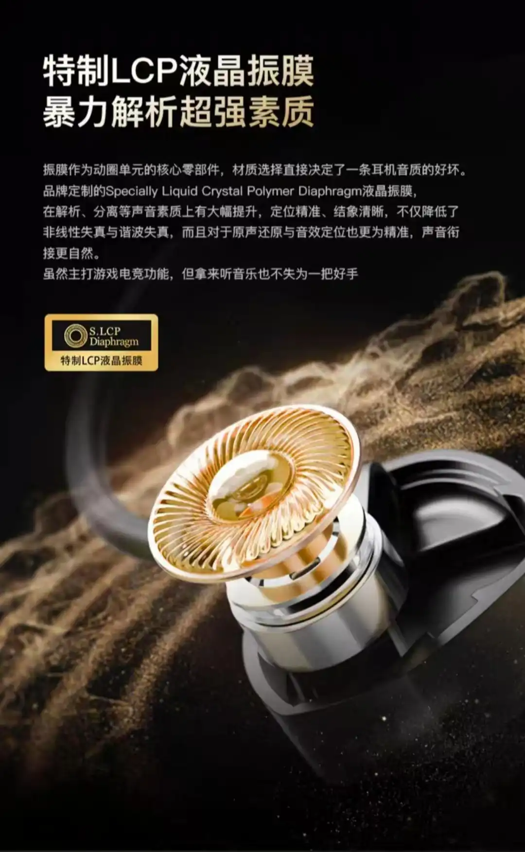 首先,在振膜上,这款耳机采用了特制LCP液晶振膜,这种振膜在解析、分离等声音素质上都有大幅提升,在进行游戏时可以达到定位精准、结象清晰的效果,这不仅降低了非线性失真与谐波失真,而且对于原声还原与音效定位也更为精准,声音街接更自然。既然电竞效果都能如此优秀,那么音乐方面自然也不在话下,在中低高频下都能达到很清晰的音乐水准。