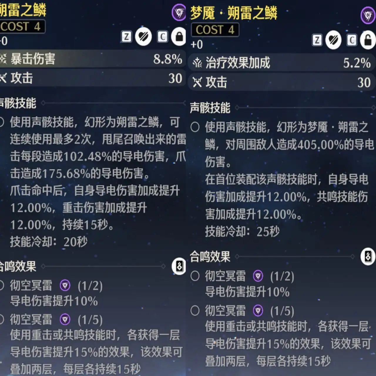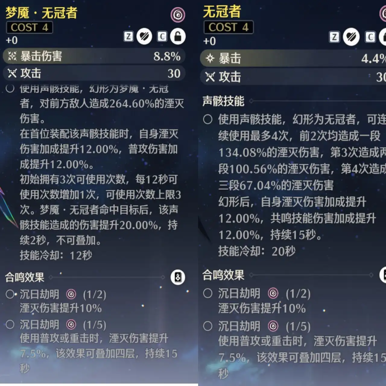 自2.0版本更新后出了7个4c梦魇声骸,对比原声骸优化了释放形式和buff加成,但也不是全都需要进行刷取更换,本期将对这些梦魇声骸进行对比和推荐。仅考虑角色0+0或0+1。1.2.首先是梦魇·无常凶鹭和梦魇·朔雷之鳞(高天套)