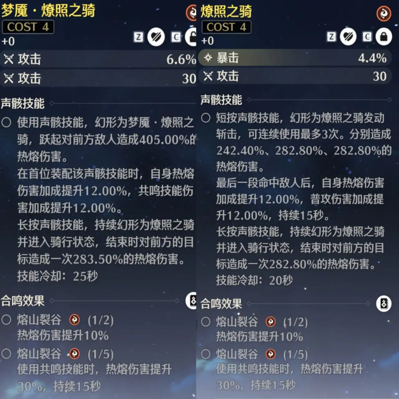 本体加成不变,改为首位装配无需释放即可生效,但是相较原声骸会多一点充能压力,算是各有优点,哪个词条好用哪个,已经毕业了也没必要刷新的。6.梦魇·燎照之骑