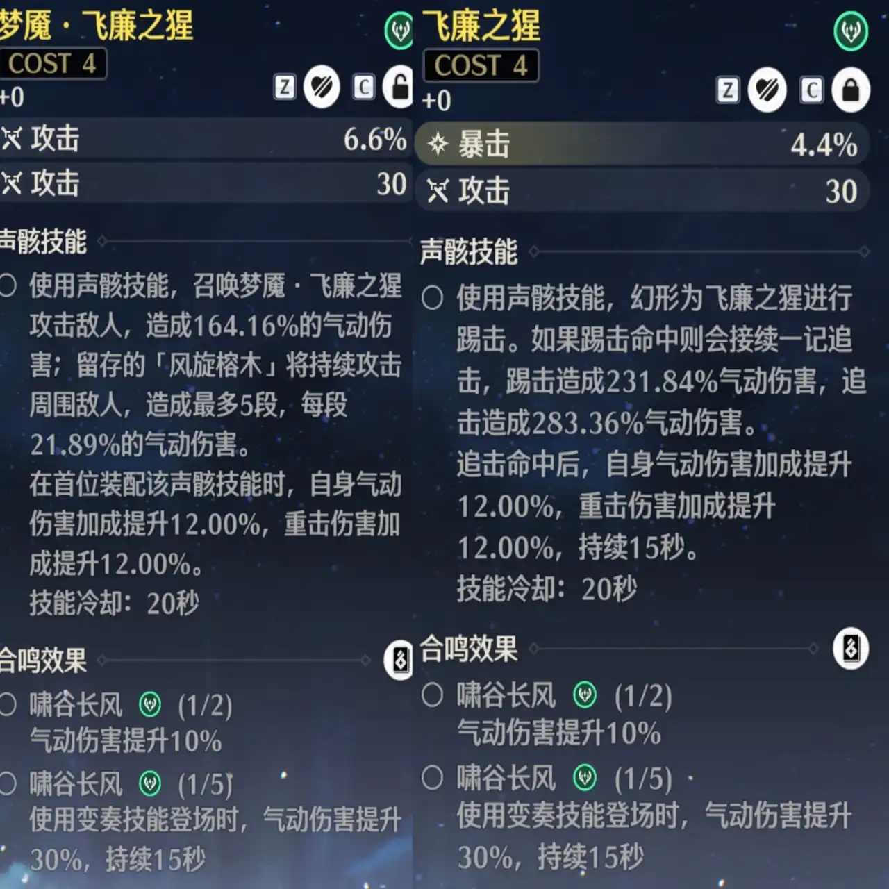本体加成由共鸣技能加成改为普攻伤害加成,独立三段攻击和首位装配即生效,原声骸的共鸣技能加成更适合小西王丹瑾,而梦魇版的普攻伤害加成更适合椿,而且无需释放就可以吃满加成,椿玩家强烈建议刷取。5.梦魇·飞廉之猩