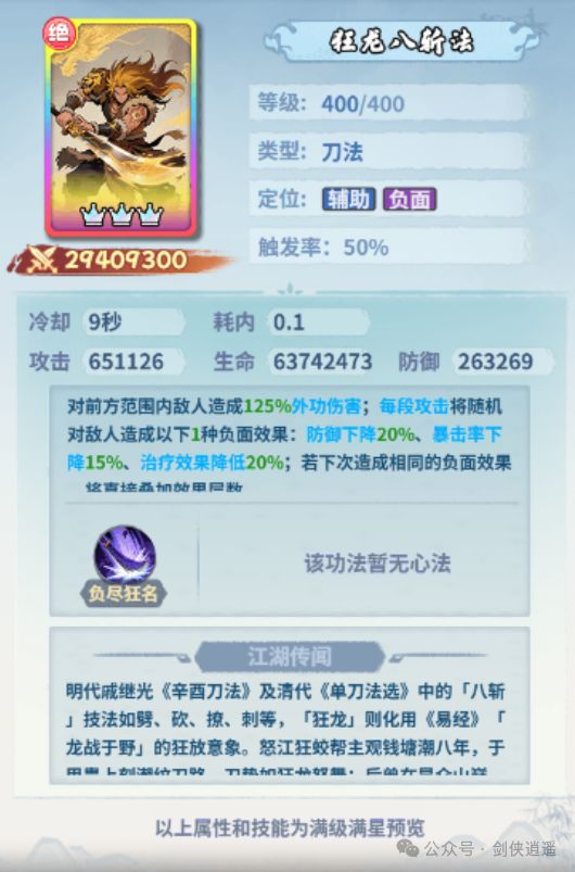 ①简单直接,高效负面狂龙八斩法技能效果简单直接,能一次性给敌方挂上多重负面buff,可降低敌方防御、降低敌方暴击率、降低敌方受治疗效果,若造成相同效果还能叠加层数,对敌方的防御、输出与续航三围做了全面的削弱②泛用输出功法狂龙八斩法能给敌方挂上多样的负面buff且自身输出倍率也不低,可以配合其他高伤功法打伤害,若少侠因苦恼功法搭配而不知道培养哪门功法时,狂龙八斩法可以作为泛用的负面辅助功法加入各种搭配
