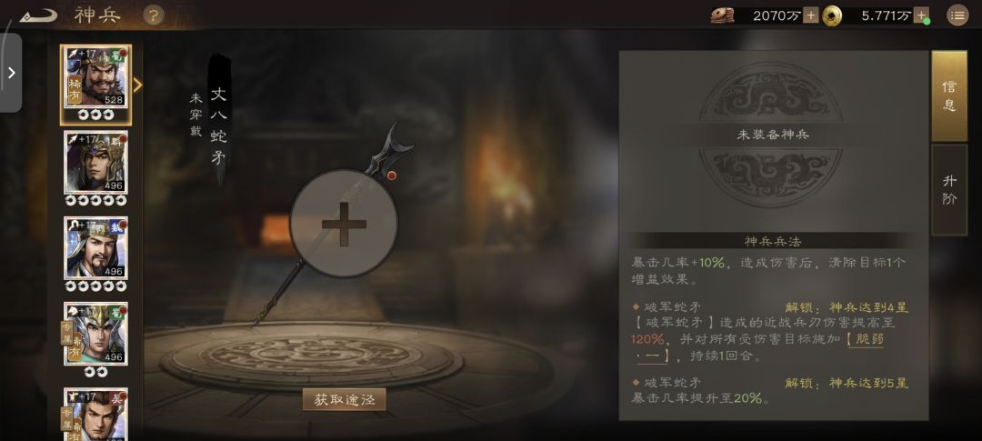- 大招:自身获2回合“万人敌”,打周围160%兵刃伤害,临时加20%暴击;被暴击的敌军会“混乱”1回合,能打乱敌方节奏。