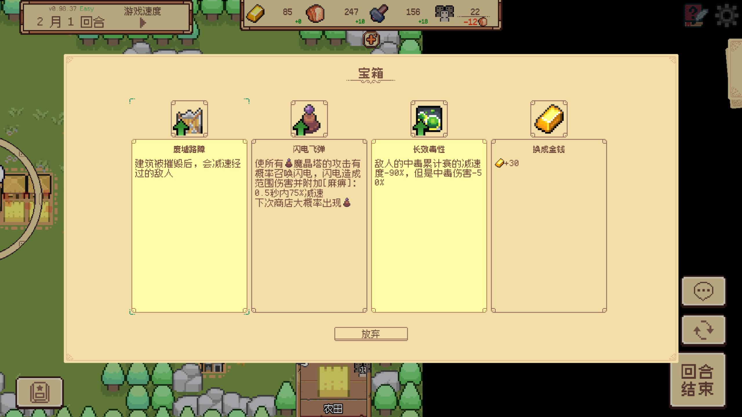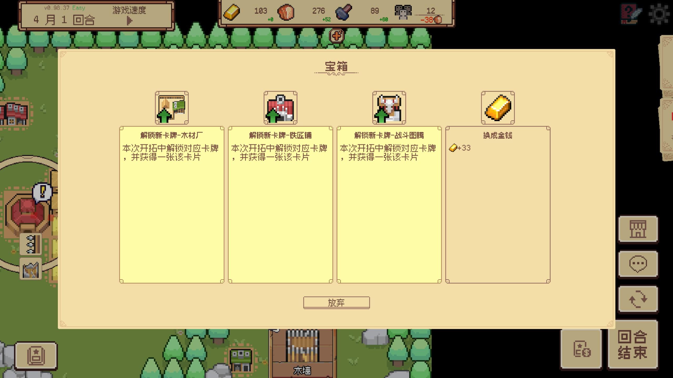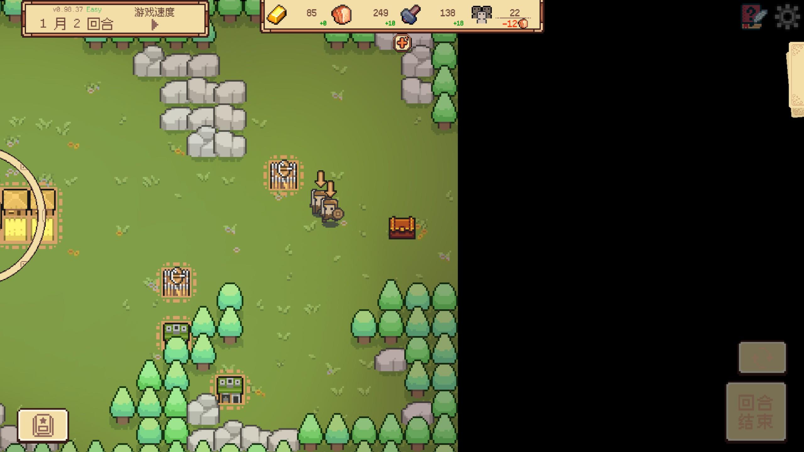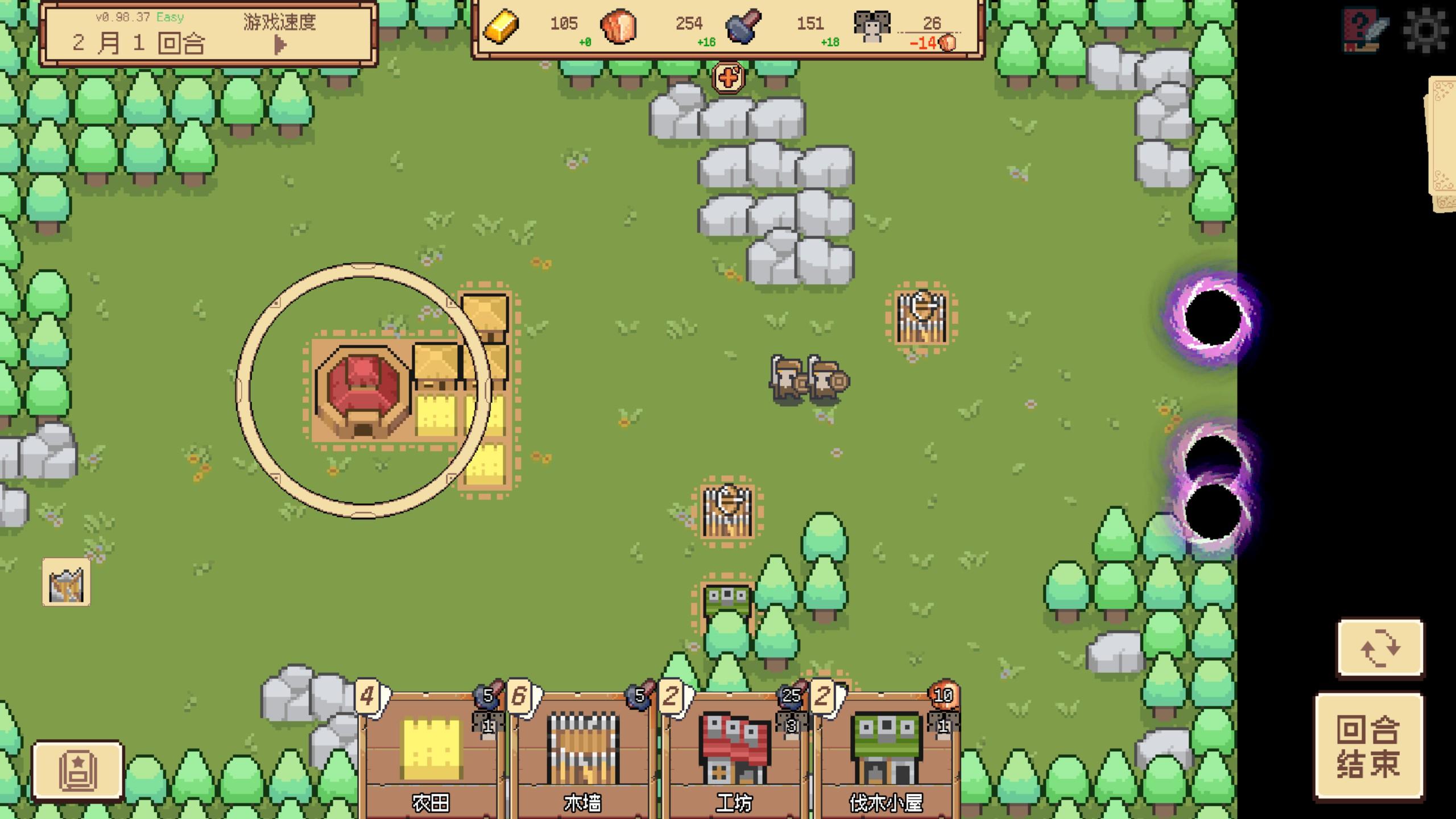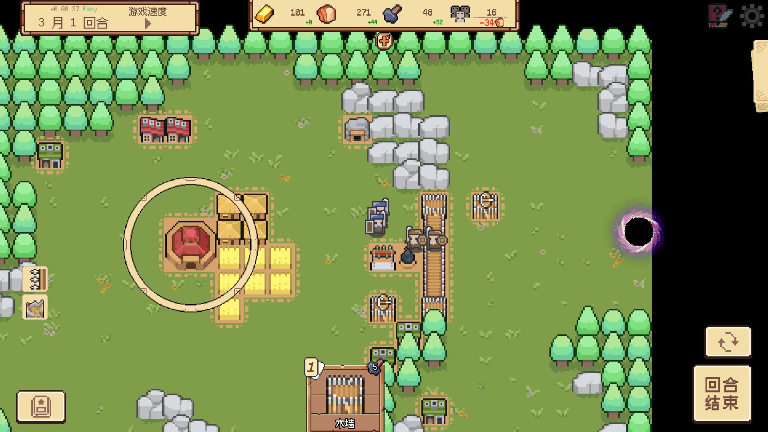 你作为王国新晋的开拓者,来到的自然是一片完全未开发的荒野上。眼前只有最基本的资源和一等待规划开拓的土地。与传统建造游戏不同的是,这个游戏是回合制的,资源不是一直产出的,是每个回合进行给予,并且每隔一个回合就会有敌人来入侵你的地盘,月末敌人还会发起总攻。