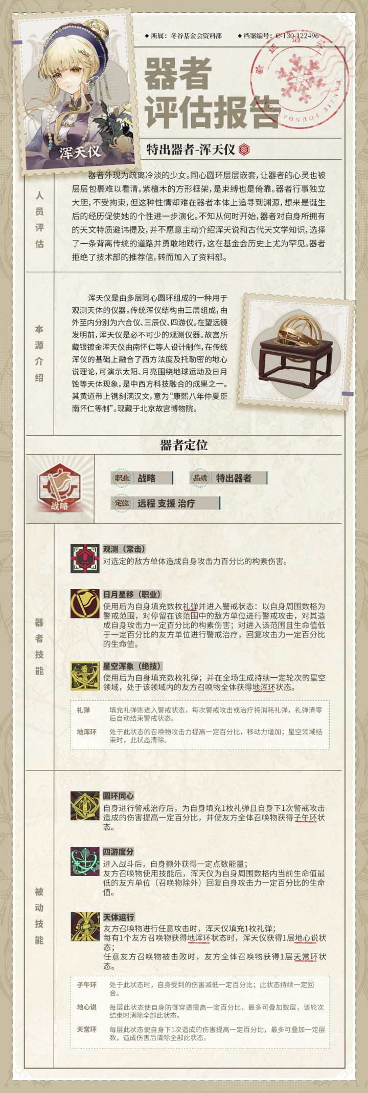 被动2:进入战斗后,自身额外获得一定点数能量,队友召唤物使用技能,浑天仪为自身周围数格内当前生命值最低队友(召唤物不行)回复自身攻击力一定百分比生命值。