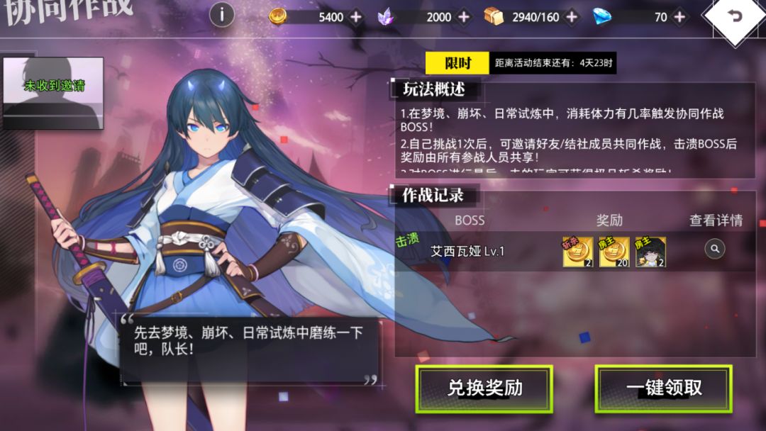 在梦境、崩坏、日常试炼中,消耗体力即有概率触发协同作战BOSS,每个玩家同时最多只可触发1个BOSS。BOSS有挑战时限,触发BOSS后开始倒计时。