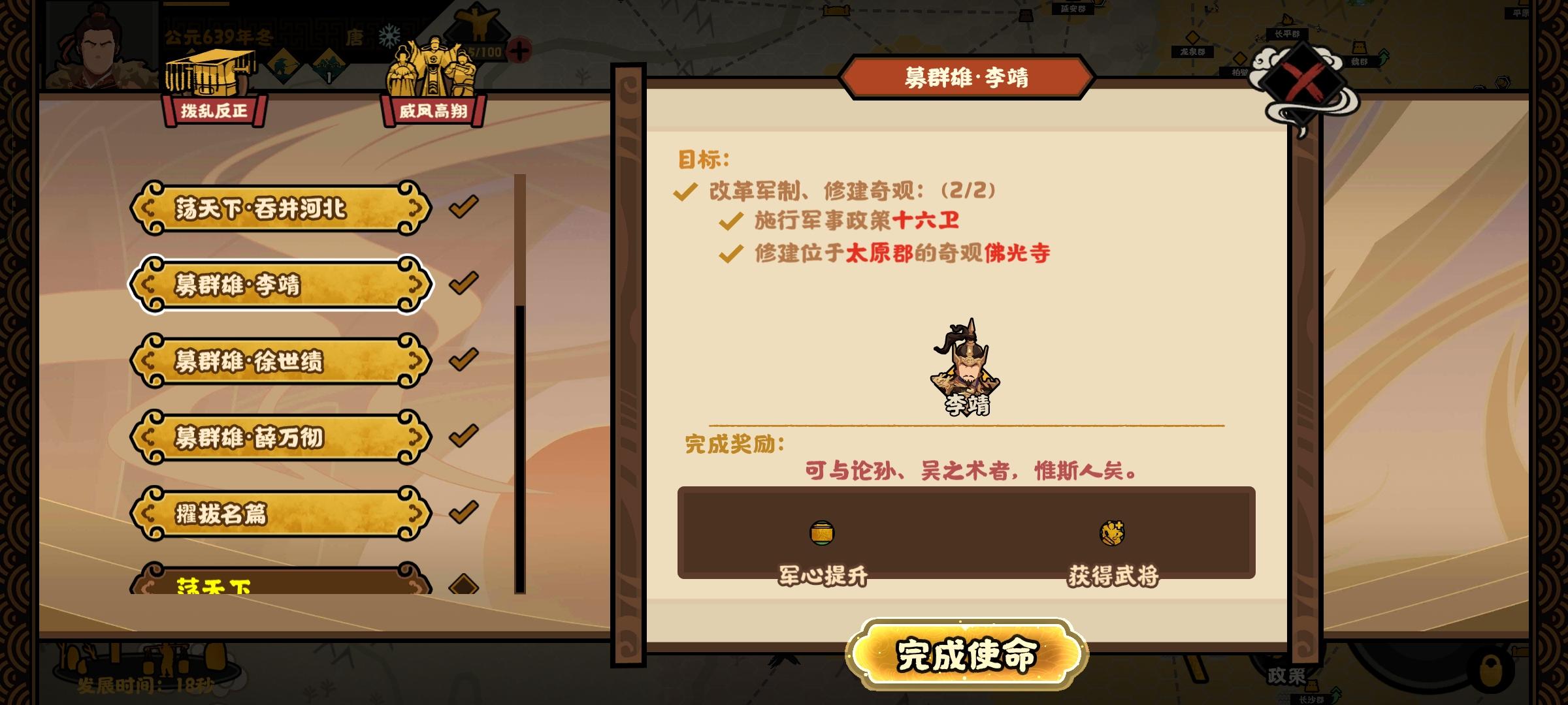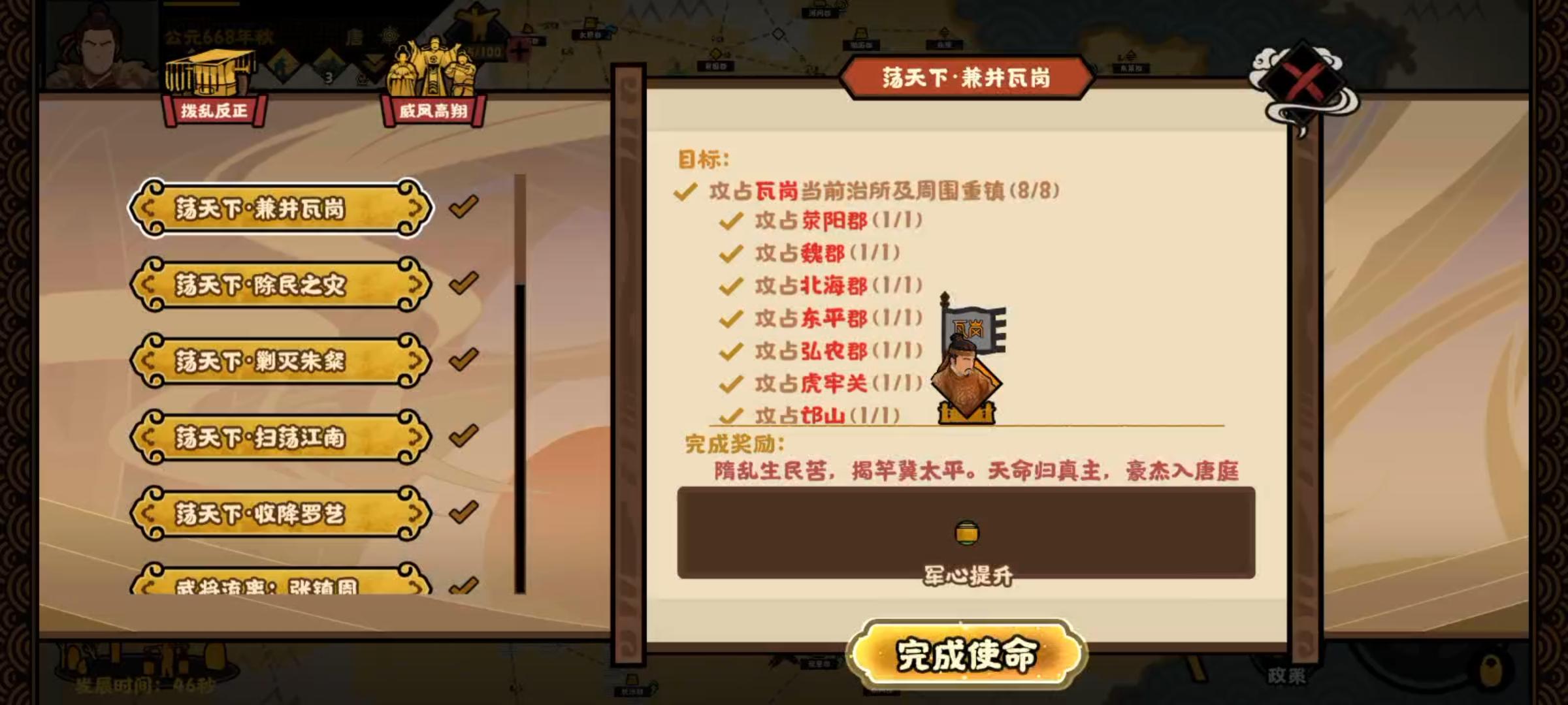 唐朝高级结局。吐谷浑、高句丽、突厥、诸蛮不用打其他都灭掉。唐朝非常简单,还有加攻占进度方略,再修建大运河攻占进度又加。武将和战斗胜利不难。唐朝开局送特殊兵种