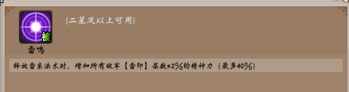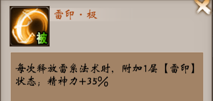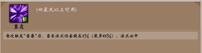 南华老仙皮肤效果(2星):释放雷系法术时,增加所有敌军【雷印】层数*2%的精神力(最多40%)