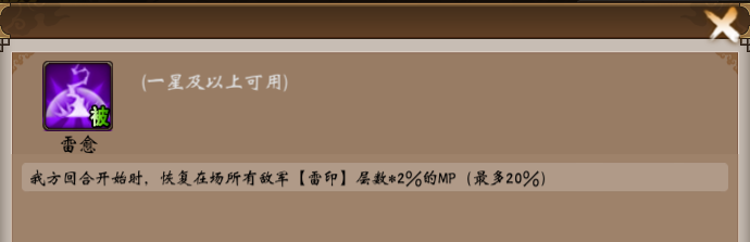 南华老仙皮肤效果(1星):我方回合开始时,恢复在场所有敌军【雷印】层数*2%的MP(最多20%)