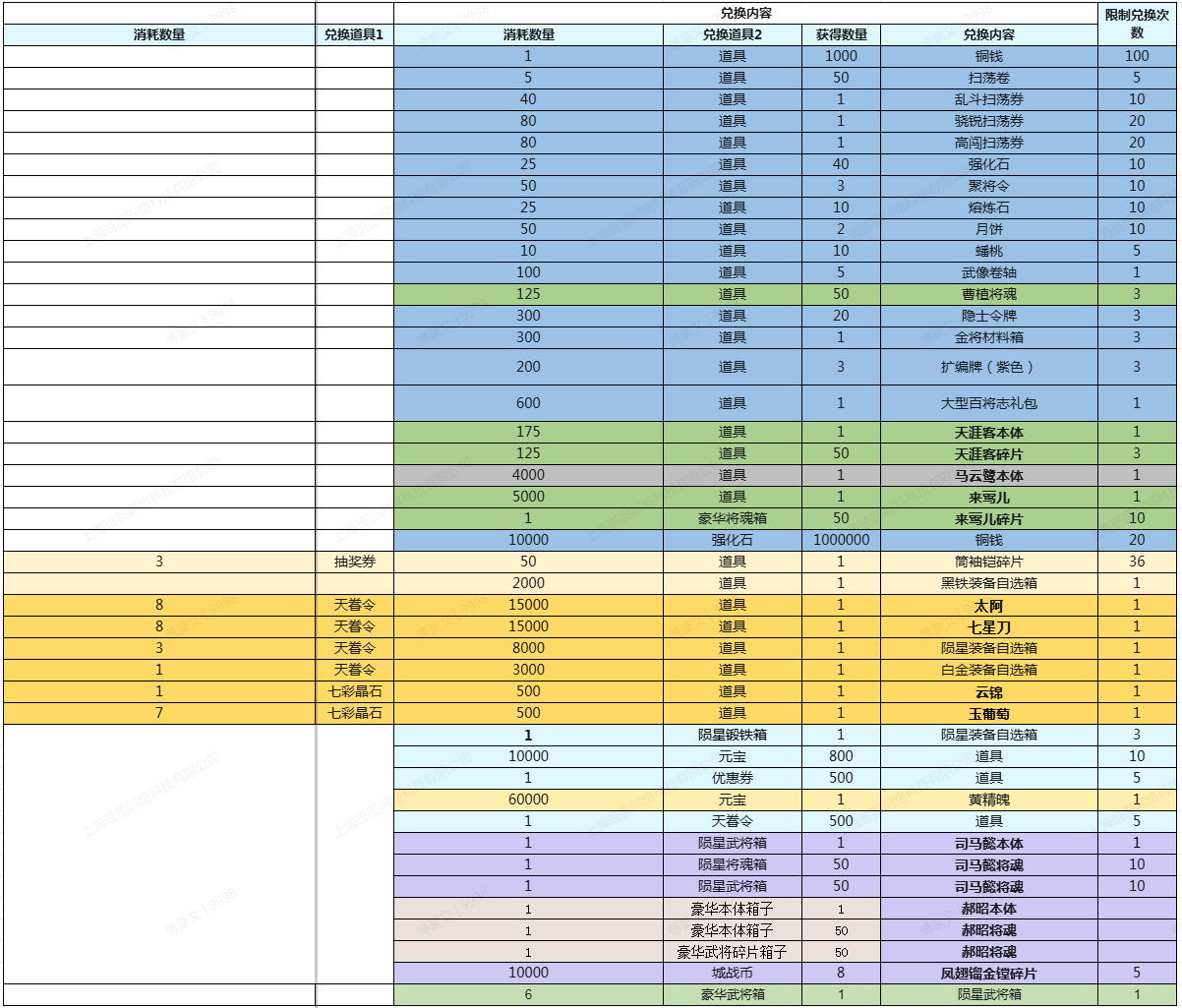 在兑换界面,主公大人们可以用“瑞照明灯”道具兑换 扫荡券、熔炼石、聚将令等武将养成必备养成资源!