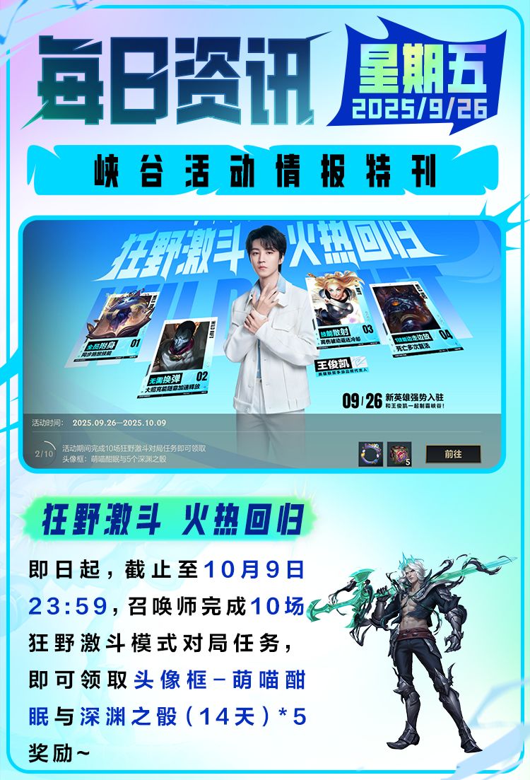 狂野激斗模式今日火热回归,更有新英雄强势入驻!即日起,截止至10月9日23:59,召唤师完成10场狂野激斗模式对局任务,即可领取头像框-萌喵酣眠与深渊之骰(14天)*5奖励~