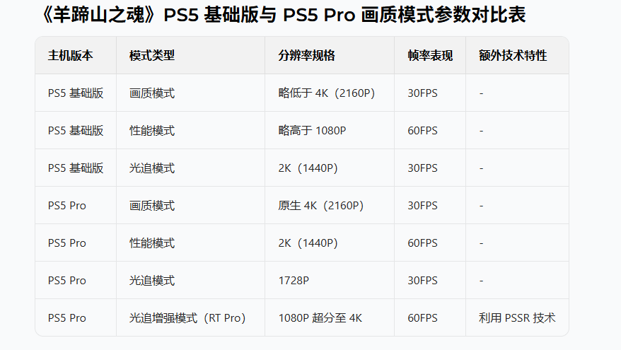 而在PS5 Pro上,则提供了4种模式。 画质模式下,分辨率为原生4K(2160P),帧率为30FPS;性能模式下,分辨率为2K(1440P),帧率为60FPS;光追模式下,分辨率为1728P,帧率为30FPS;PS5 Pro 还额外提供了光追增强模式( RT Pro)。该模式下,利用了PSSR技术。分辨率1080P超分至4K,帧率为60FPS。