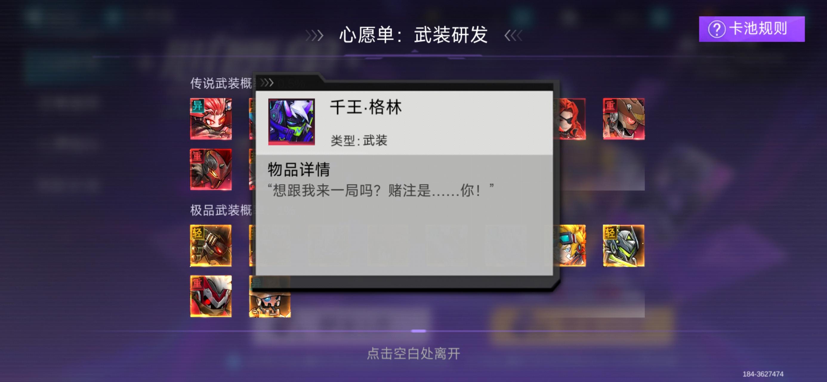 3.相比于常驻池,每个月都有限定武装池,当月当之无愧的三体人,只能用钻石抽,2000一次十连。好像经常会开心愿池子,心愿池子抽卡次数达50送十连,100抽送二十连。相当于7折,因为普通票抽不了限定,所以相比于常驻池推荐抽心愿池子。据说还有更合适的活动池子,还没见过不做评论。