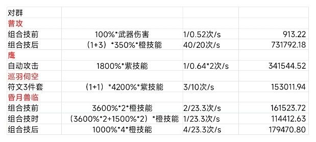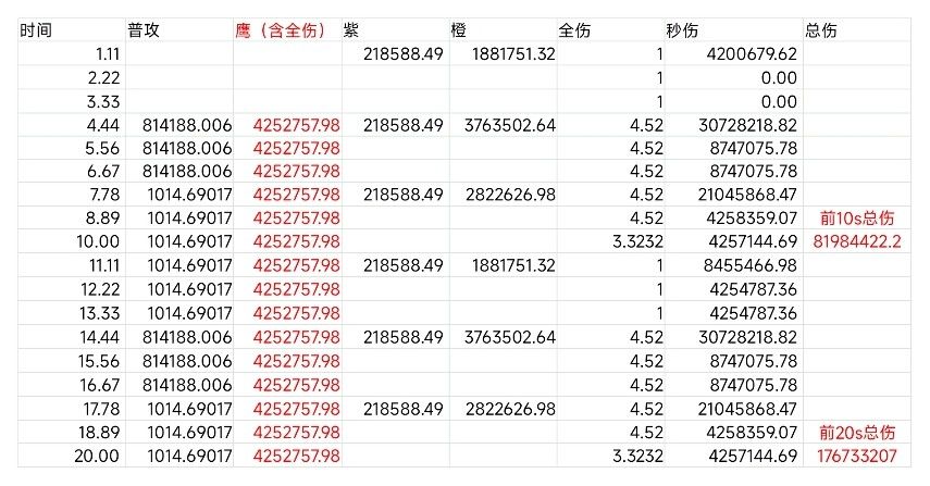 在计算上,我们优先对“鹰”的伤害先进行面板乘区计算,再进行每个区间的“各类易伤”乘区计算,最终合并秒伤