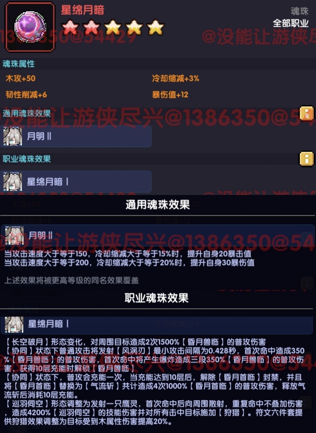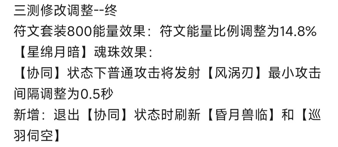 ②“橙技能-昏月兽临”和“紫技能-巡羽伺空”冷却变为固定的3.3s。当自身拥有两层风时,可手动释放“组合技-长空破月”(本身不携带魂珠就是不造成伤害,但是对群和对王魂珠都可以让组合技形态改变,变成有伤害)