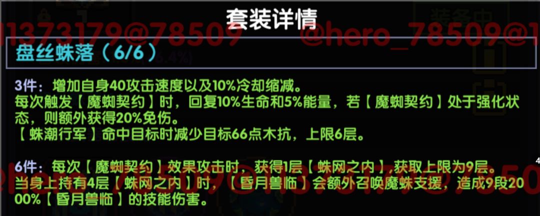 三件套效果给了40攻速以及10cd,配合武器的攻速以及星级效果给的cd,很达到200攻速,40cd的基本要求。【蛛潮行军】一共能减少396的木抗
