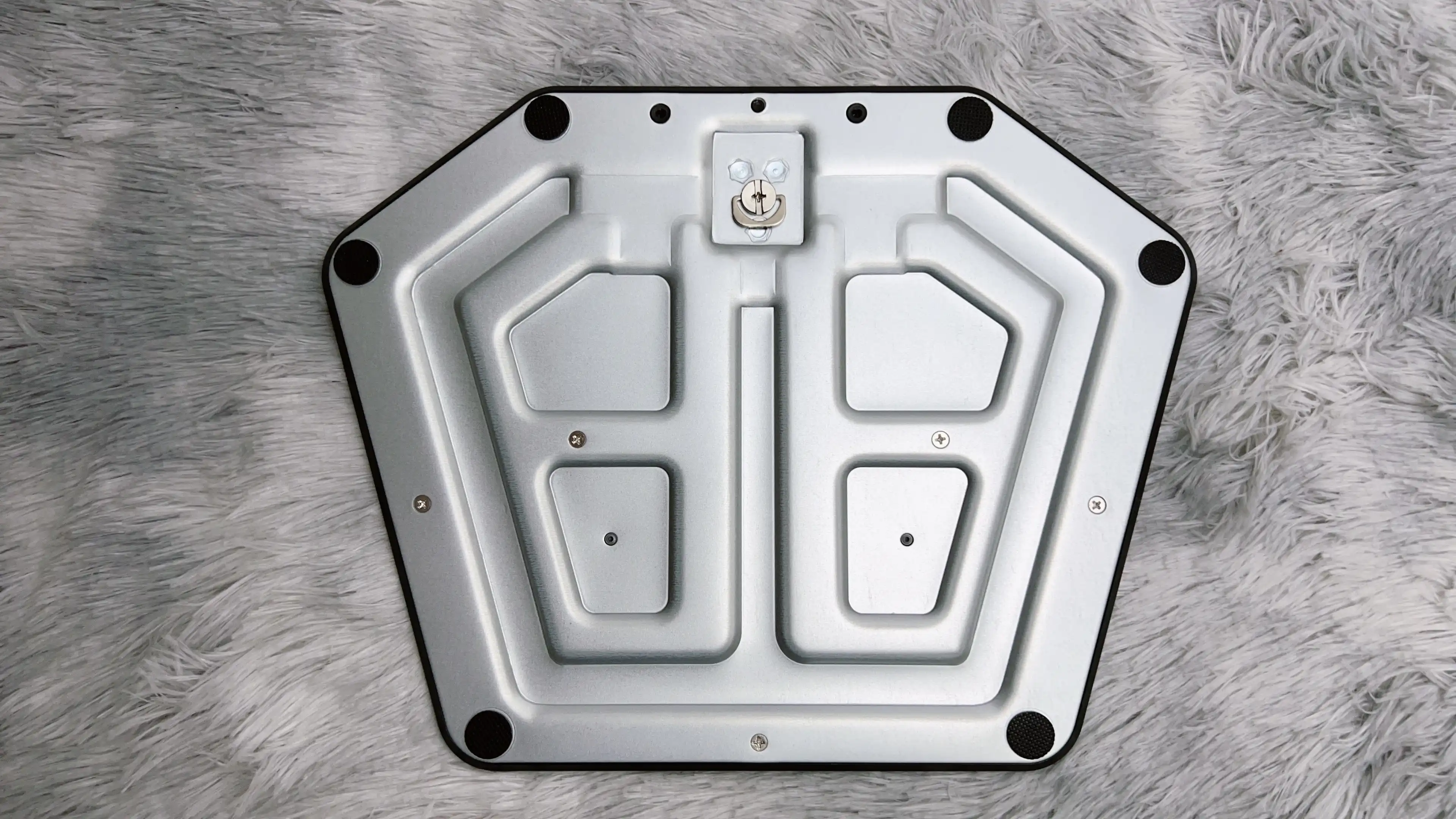 底座是金属的,六个角带有六个圆形的橡胶防滑贴。底部的螺丝带有挂耳拉环,可以通过拉环拧紧螺丝。支架对接处是卡扣设计,安装超级方便,支架“啪嗒”一扣就能用,没有螺丝刀也能操作,整个设计非常贴心。