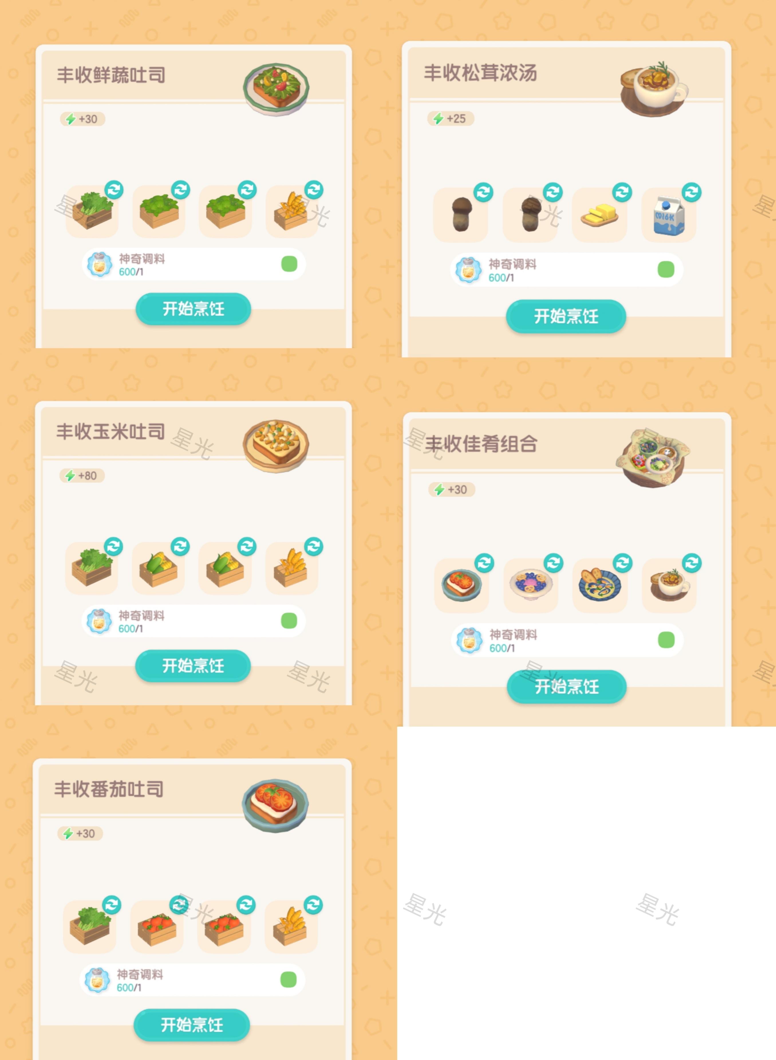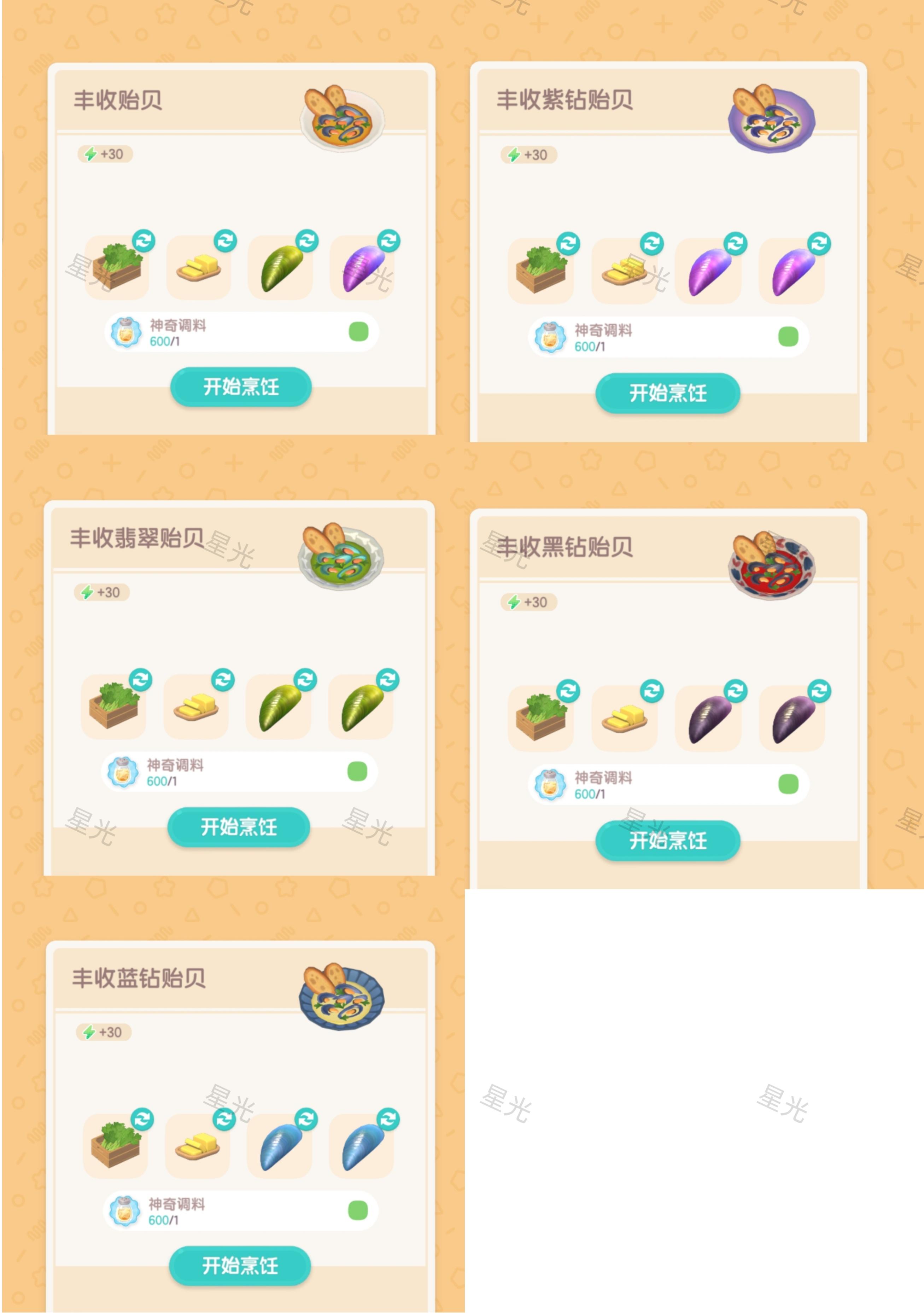 2.丰收贻贝,目前只有5种食谱(丰收黄金贻贝要等第二周鱼潮潮才能做),如图5;