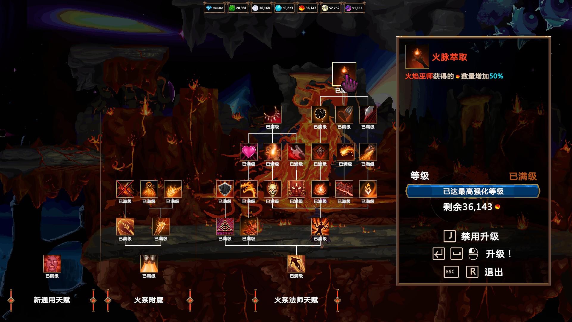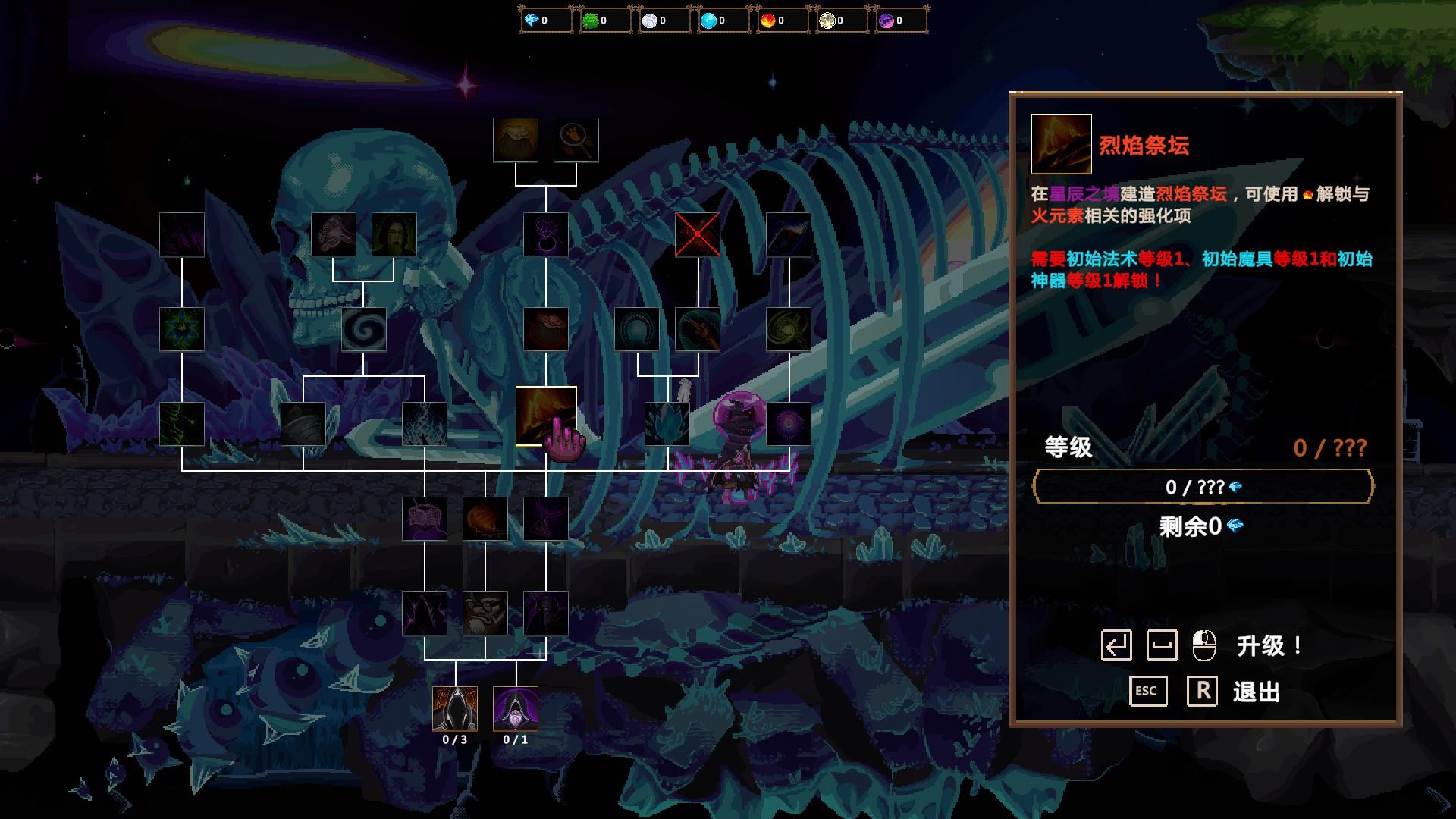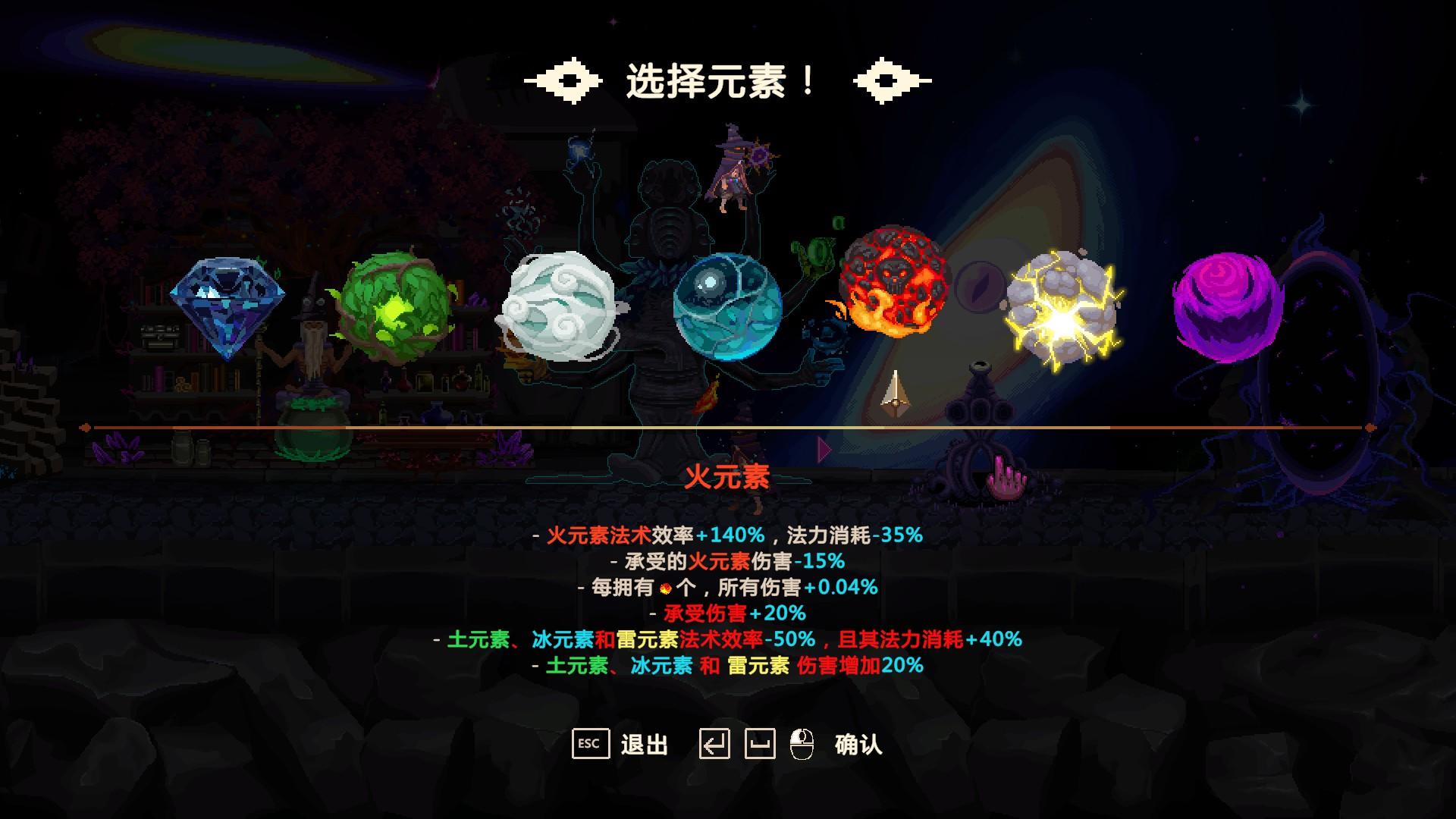 死亡会重生回到水晶守护者面前,但是所有获得的神器和力量都将被夺走,能留下的只有你在探险中找到的水晶和元素法球,利用水晶献祭来修复星辰之境的设施,献祭元素法球永久获得其部分力量,其实就是局外的养成成长,来提升每次冒险时角色的属性强化,并且额外的武器、魔法技能术等等,随着一次次战斗解锁并升级各种强化献祭解锁不同元素巫师的特定天赋等等。