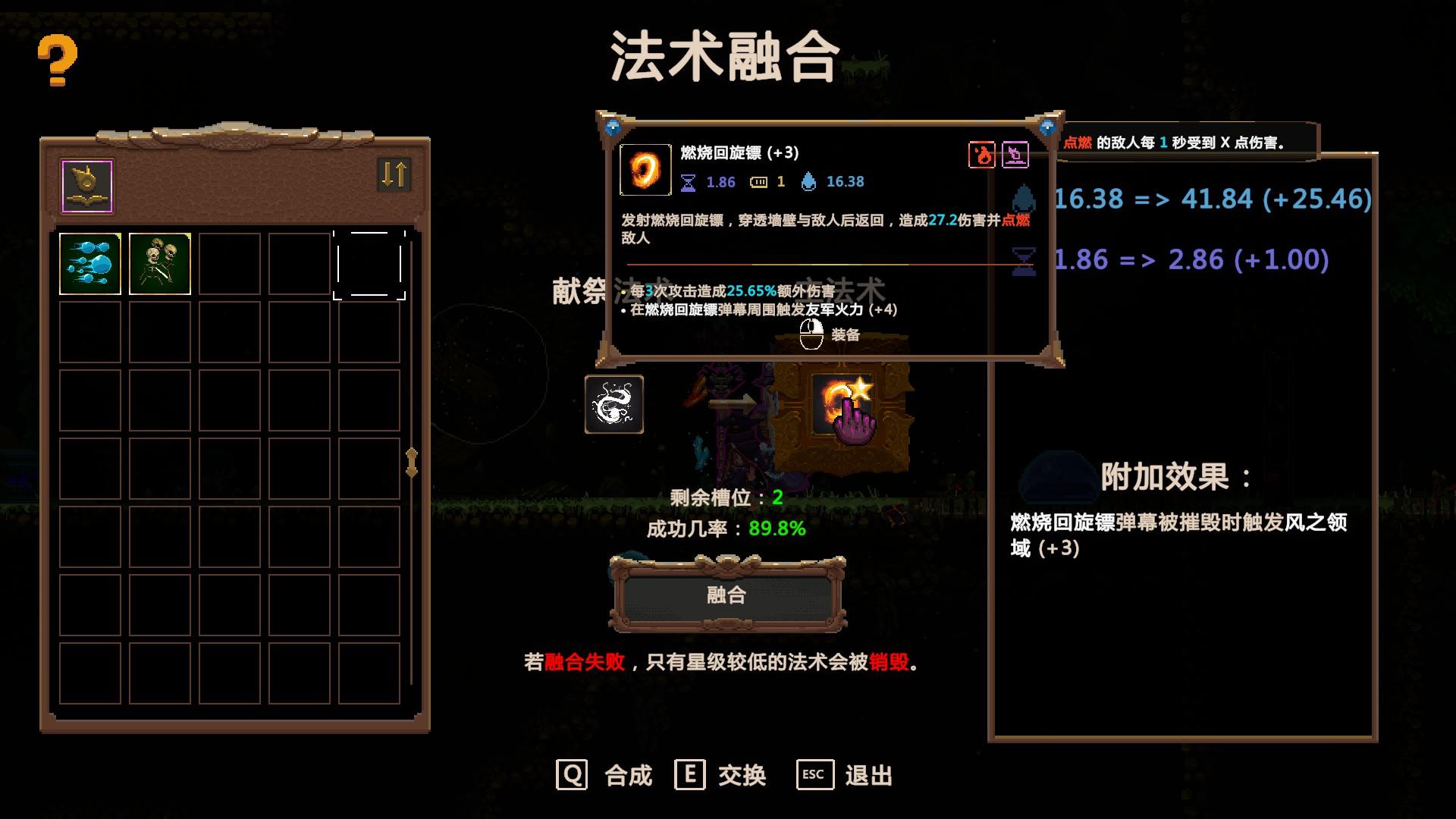 在这些世界中,你会遇到形形色色的角色,比如第一个就是织法者,悬浮在空中,在他这里,你可以将两个不同的法术卷轴进行融合从而创造新的法术,但是法术越强损毁概率越高。法术能够融合的独特机制是这款游戏的特色,比如烈焰墙作为主法术可以融合小型火球,释放时就会在你鼠标所在位置出现烈焰墙,而且从墙中心还会触发小型火球左右攻击,十分有趣。