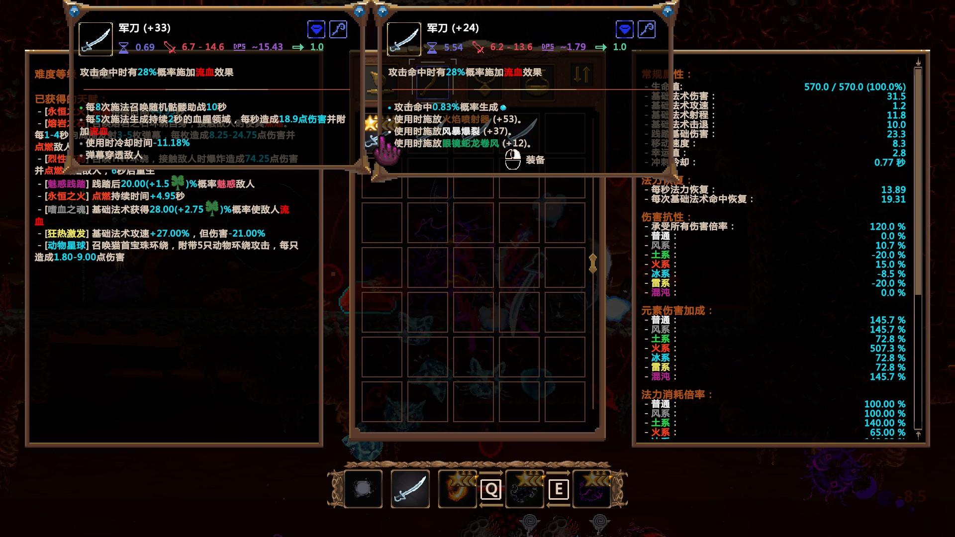 操作方式十分简单,基础攻击加魔法攻击,召唤武器,同时有着二段跳,冲刺闪避以及跳起下落震荡等动作机制。在这款游戏中你的次要法术都是通过法术卷轴发动的,比如僵尸爆裂,其本身效果是在造成伤害时使敌人中毒,每4次波动范围扩大,而且造成百分之75额外伤害还能吸取0.2生命。有些法术可以连续使用,当然需要消耗法力。