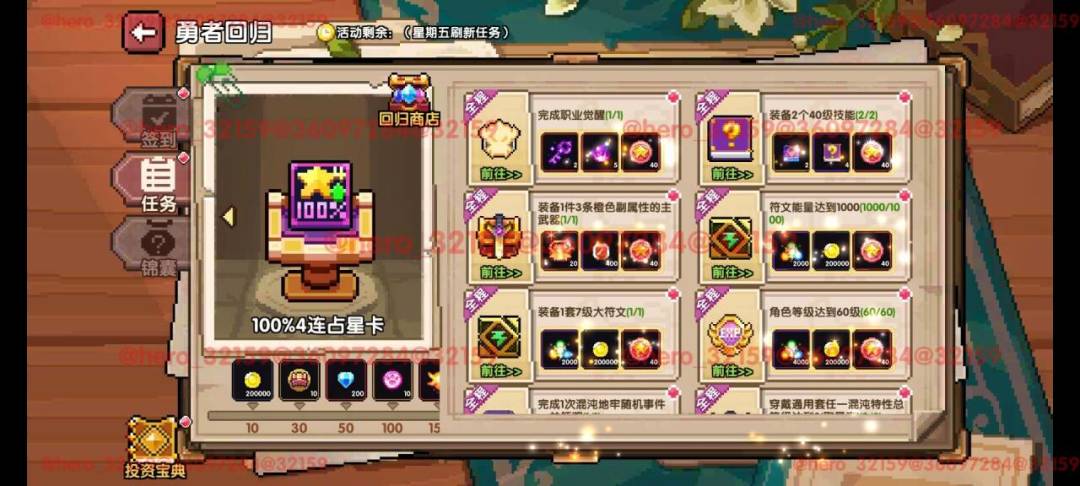 还有回归任务 偷偷看了下 最终大奖是100%四连星卡!