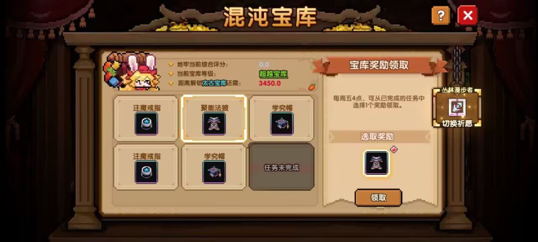 现在地牢新增了混沌宝库 提高宝库等级(可以找大佬带)每周都可以白嫖一个太古装备