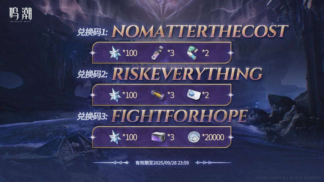 《鸣潮》2.7版本前瞻通讯兑换码【NOMATTERTHECOST】、【RISKEVERYTHING】、【FIGHTFORHOPE】请查收,漂泊者们可前往游戏内兑换领取,兑换码有效期至2025年9月28日23:59。