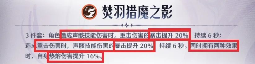 造成重击伤害时,自身声骸技能伤害的暴击率提升20%,持续6秒;