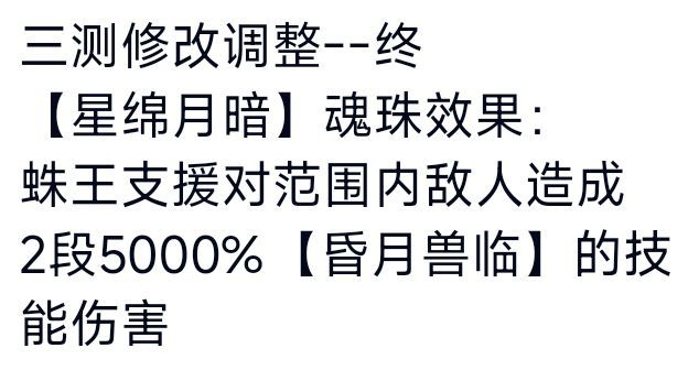 - 蛛王支援形态调整为:对范围内敌人造成2段5000%【昏月兽临】伤害(大范围)