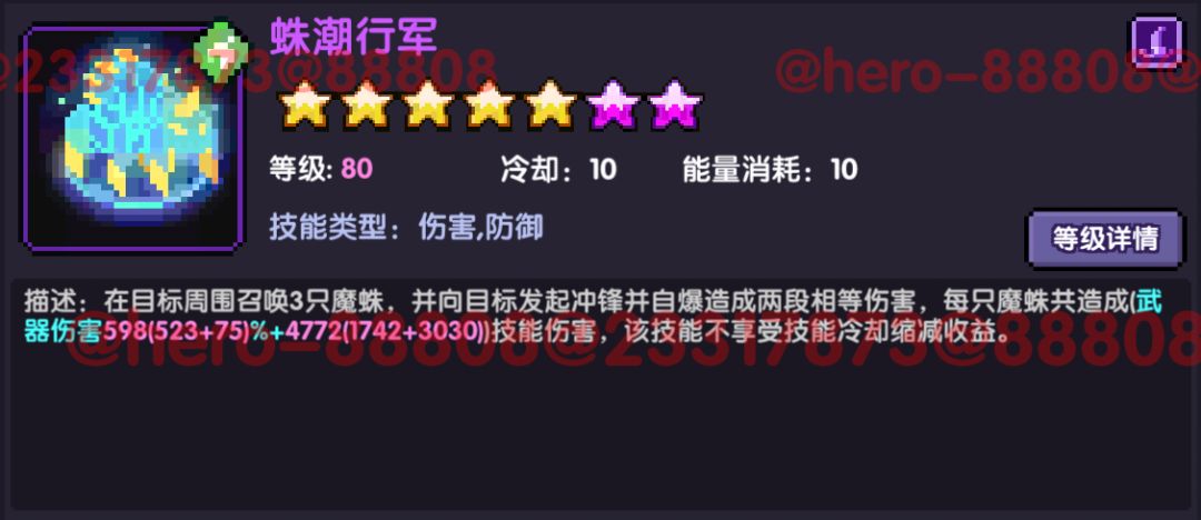 - 四星后,普攻获得强化(每10秒点一次普攻就行),激活【魔珠契约】,此时伤害得到大幅提升(需装备【蛛潮行军】,相对于1星,提升了超100倍伤害)