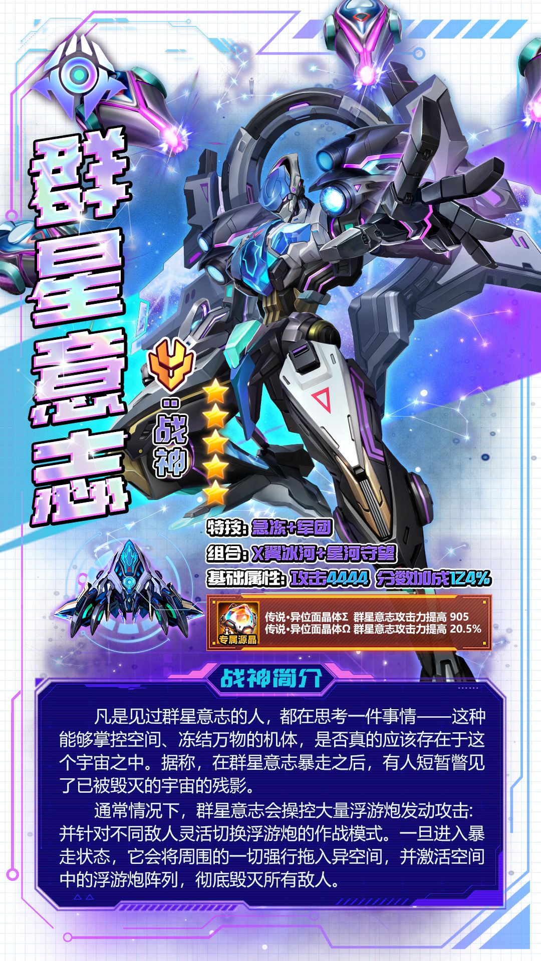 寒冰凝聚,群星闪耀。冰霜与星辰汇聚而生,全新战神系列装备【群星意志】登场!急冻特性加持,浮游炮阵列在异界战场中绽放寒光,群星意志将在战场展现前所未有的压制力!