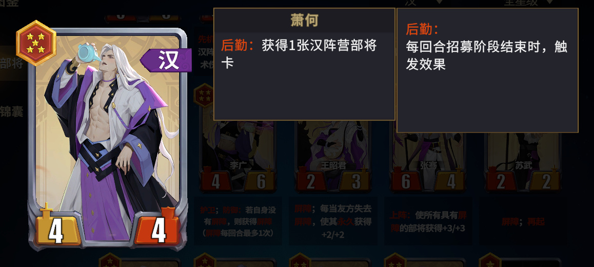 - 萧何:前中期用来快速收集阵容的"资源库",与白虎搭配效果更佳。