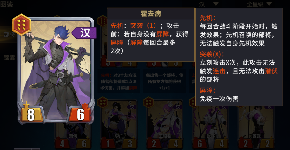 在第十回合左右升至商店6级后,需要尽快找到【吕后】和【霍去病】这两张核心部将。【霍去病】是汉阵营的主力输出,而吕后则可以大量触发队友技能效果,是决战的关键。进入决战阶段,可考虑出售【萧何】替换为【相柳】等功能卡,根据战局需要灵活调整。利用【东方朔】为每个人加上永久屏障,形成以【霍去病】为主力输出、【卫子夫】为团体辅助、【吕】后提升阵容上限、【李广】作为防御手的完整体系。