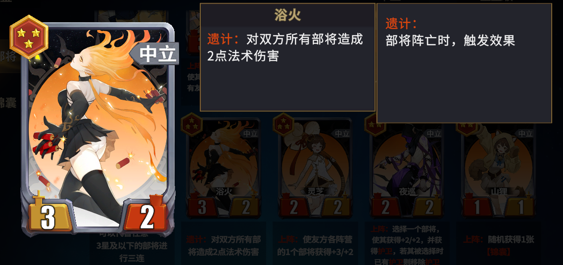 屏障汉的另一个"天敌"是浴火,对此没有特别高效的反制方式。如果对方上浴火,通常只能硬抗。不过值得注意的是,如果浴火被霍去病突袭提前阵亡,其遗计伤害后还有吕后再重新套盾,对方可能相当于"白忙活"。若非要反制浴火,可采用以下特殊策略:利用【日巡】给商店里的1攻卡牌施加护卫,然后再买过来,就可以得到一个只有1点攻击力的护卫卡。但这种反制手段需要牺牲掉阵容中的所有【卫子夫】和【王昭君】,是否值得需要谨慎思考。