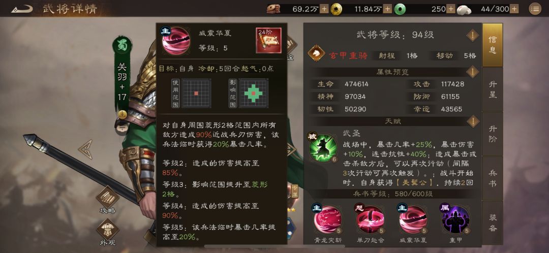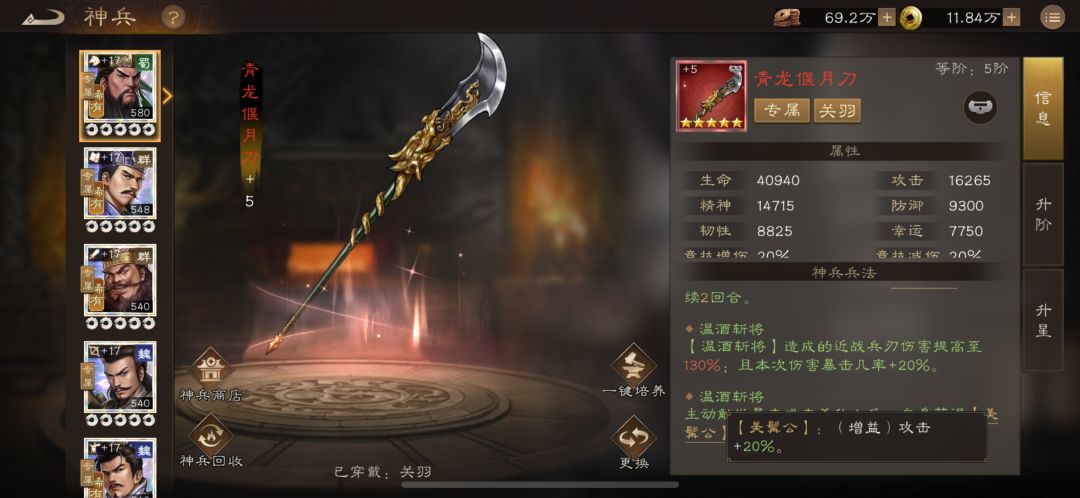 · 专武优先:关羽的专属武器青龙偃月刀至关重要,建议优先提升至5星。5星后,仅需“暴击”即可刷新【美髯公】攻击加成状态,使其在对抗Boss等高难场景下也能保持巅峰输出。