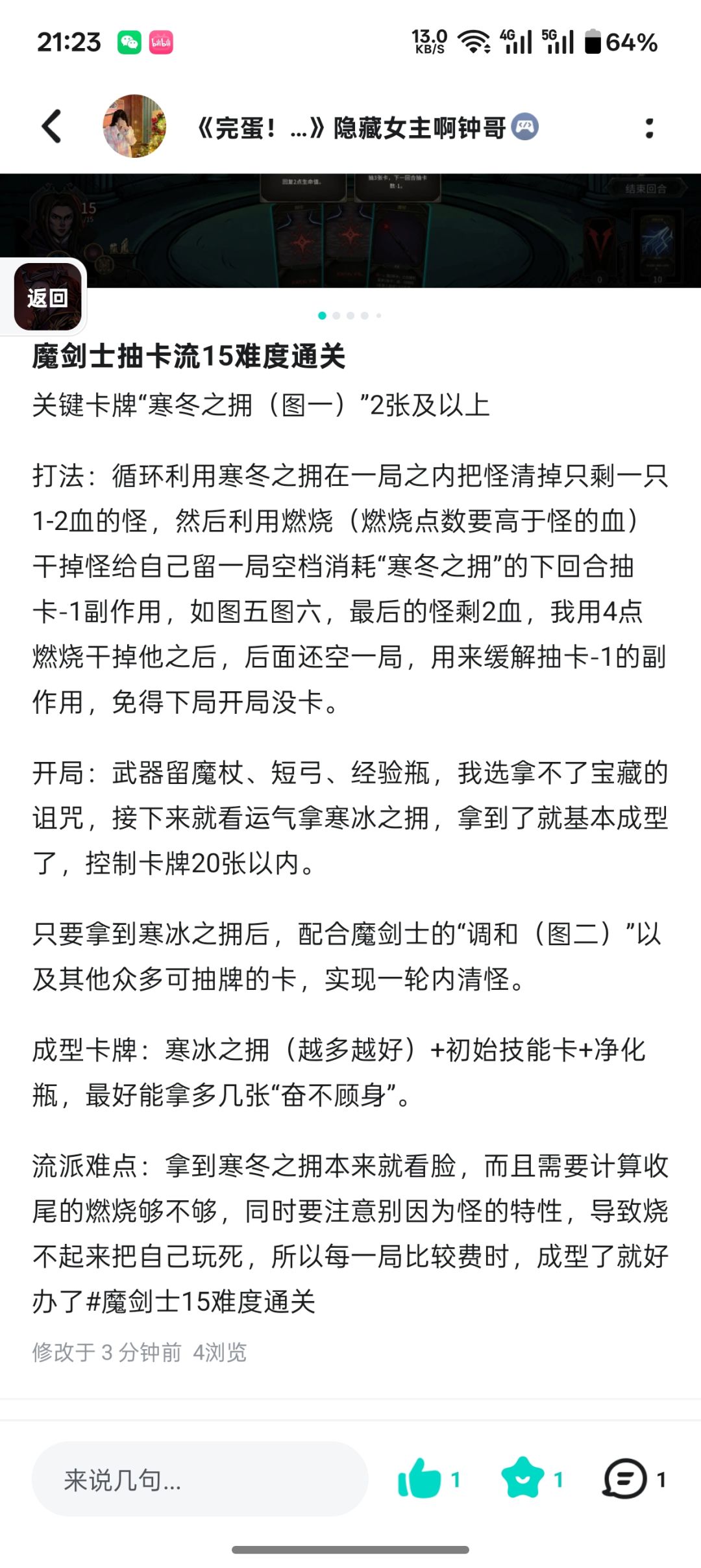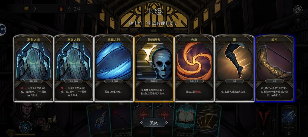 开局: 武器留魔杖、 短弓、 经验瓶, 诅咒我选拿不 了宝藏的诅咒, 接下来就看运气拿 寒冰之拥, 拿到了 就基本要成型 了, 控制卡牌20 张以内。 只要拿到 寒冰之拥后, 配合魔剑士的“ 调和(图二)“ 以及其他众多 可抽牌的卡, 实现一轮内清怪。