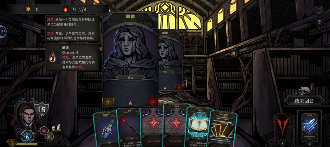 打法: 循环利用 寒冬之拥在一局之内把怪清掉,只剩一只 1- 2 血的怪, 然后利用 燃烧( 燃烧点数要高于怪 的血) 干掉怪给自己留一局空档 用来消耗“寒冬之拥” 的 下回合抽卡-1副作用。如图五图六, 最后的怪剩 2 血, 我用 4 点燃烧干掉他之后, 后面还空一局, 用来 缓解抽卡- 1的副作用, 免得下局开局没卡。